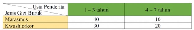 - Peluang seorang anak penderita gizi buruk jenis Kwashiorkor adalah 50%.