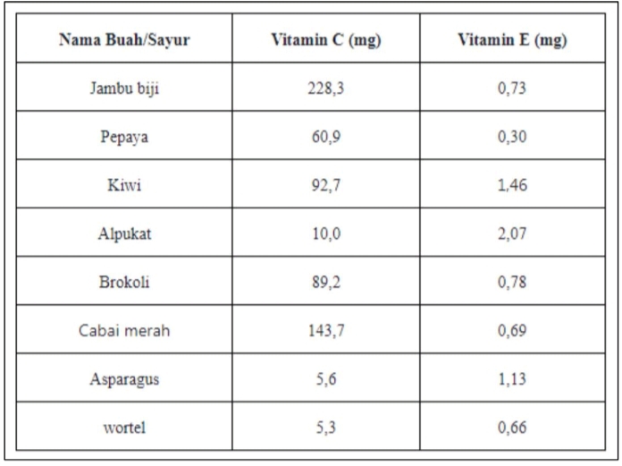 Vitamin yang dapat menjaga imunitas tubuh antara lain yaitu vitamin C dan E. Berikut ini tabel kandungan vitamin C dan E per 100 gram pada beberapa buah dan sayur.
